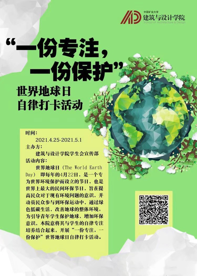 2021年4月25日—05月15日,为引导青年学生保护地球、增加环保意识,建筑与设计学院学生会宣传部将世界地球日宣传与学生的自律专注培养结合起来,开展了“一份专注,一份保护”世界地球日自律打卡活动。