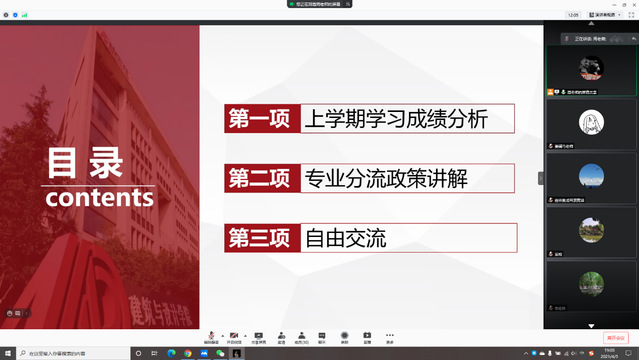 本次会议分为“上学期学习成绩分析”、“专业分流政策讲解”、“自由交流”三大部分。首先,周天涯老师对机械类两个班进行了整体成绩分析,从补考、挂科情况和加权成绩两个方面进行了详细的数据分析,让家长们对孩子的专业及学习情况具有一定的了解。周天涯老师希望家长能够和孩子多沟通,一起思考提高成绩的方法,随后,阐述了机械类分流的专业方向及招收名额,通过举例详细讲解了专业分流的志愿录取原则,并且为家长们提供了一些专业分流的建议,希望家长和孩子一起做出一个满意的选择。