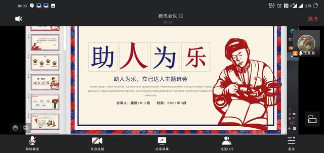 3月24日下午4:00,建筑与设计学院建筑18-3班全体同学在线上开展团日活动,本次团日活动围绕“助人为乐,利人立己”主题展开。