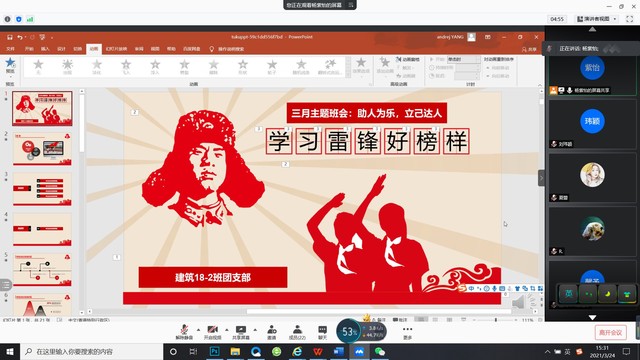 为引导同学们领悟雷锋精神的真谛,帮助同学树立正确的世界观、人生观、价值观,深入构建社会主义和谐社会所不可缺少的民族精神。3月24日下午,建筑学18-2班在线上开展了“助人为乐,立己达人”主题团日班会。建筑学18-2班全体同学参加了本次班会,班会由团支书杨紫怡主持。