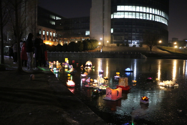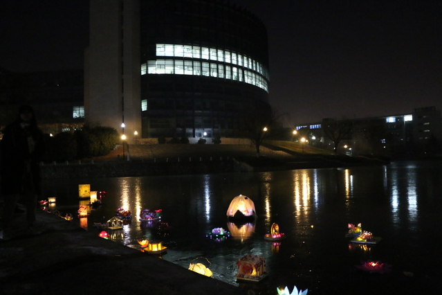 活动中,组织部成员将同学们亲手制作的花灯在白棚下布展,各式各样的花灯展现了同学们的无限创意,同时也表达了同学们对2021年的期待与畅想,渲染出浓浓的节日氛围。晚上7点,为保证参加活动学生的安全,团委的工作人员在湖边拉起安全线,同学们开始陆陆续续的将花灯放至湖面,看着荷灯随湖水缓缓飘远,同学们纷纷低头许愿,以寄托对生活的无限祝福。