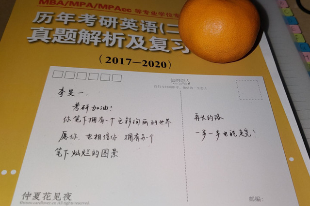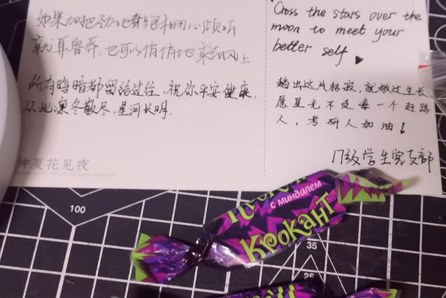 “再长的路,一步一步也能走完”、“你笔下有一个色彩绚丽的世界,愿你,也相信你,拥有另一个笔下灿烂的图景”、“星光不问赶路人,时间不负有心人”,一句句鼓舞的话语,汇成同学们对考研学子的真诚祝福。17级党支部的成员自己亲笔写下明信片,将满满的祝福送到了每位考研同学的桌子上,同时还准备了一些小零食,希望这些小惊喜能给复习阶段的考研学子减轻疲劳和压力。