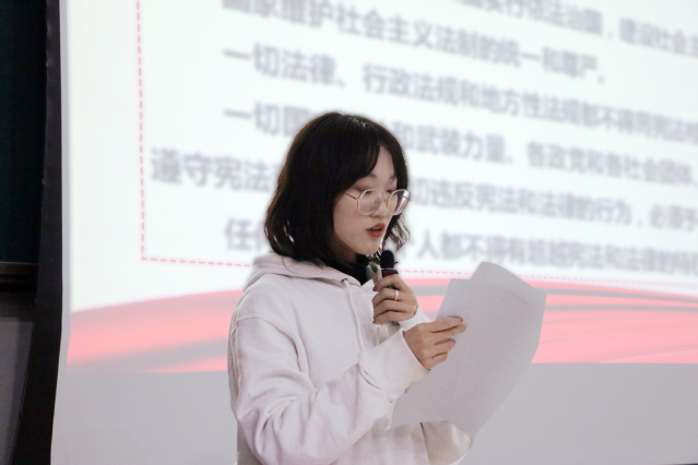 大会以一段宪法宣传片开始,生动形象地展现了宪法在日常生活中的重要作用。周天涯老师以“为什么12月4日是国家宪法日”为引,向学生们讲述了我国宪法的发展历程,强调了宪法的重要作用和重要意义。随后,学生代表牛嘉琪带领同学们诵读了部分宪法章节,加深同学们对于宪法的掌握与遵守宪法的思想认识。由于20级新生即将迎来期末考试,周天涯老师带领同学们一起学习了《中国矿业大学学生违纪处分管理规定》的部分条例,同时通过典型案例警示,向同学们再次强调了学风考纪的重要性。最后,周天涯老师叮嘱道:“取得好成绩的方法只有‘诚信+学习’,学习是解决问题的关键。”会上,周天涯老师还对后续工作安排和活动做了简要介绍。