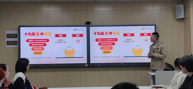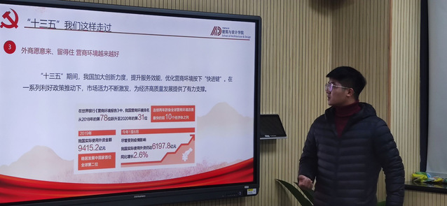 首先,王立志同学向党支部成员们介绍了十九届五中全会的会议简介、以及全会精神。他介绍了会议上提出的扎实推动共同富裕、坚持创新在现代化建设全局中的核心地位、坚持党的全面领导、加强党中央集中统一领导等方针政策。接下来孙健乔同学对“十三五我们这样走过”系列内容进行总结,并列举了十三五期间中国取得的成就。随后,徐锦添同学介绍了问策“十四五”部分,向大家展现了“十四五”规划编制工作开展网上意见征求活动以及“我为家乡‘十四五’规划编制献一策”活动内容,以及国家对第十四个五年规划的相关政策。