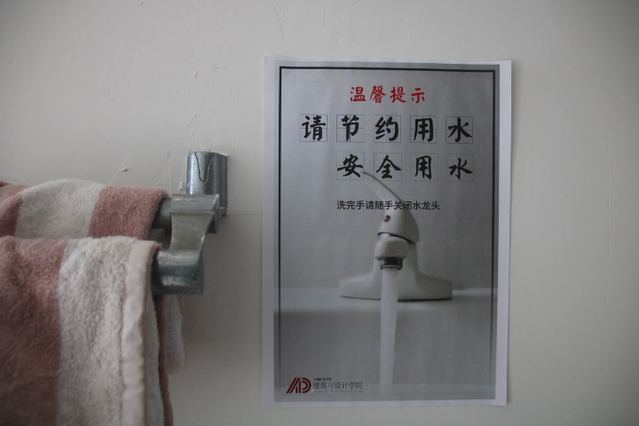学生会成员在宿舍的电开关旁边张贴了“节约用电”的海报。海报上将灯泡一分为二,一半绿色一半写着节约用电,并且在开灯时正好可以看见,起到了提醒作用。同时,学生会成员还在厕所里贴上了“节约用水”的海报。海报上印着一个未关的水龙头,以及“洗完手随手关闭水龙头”的标语,以此来提醒同学们节约用水。