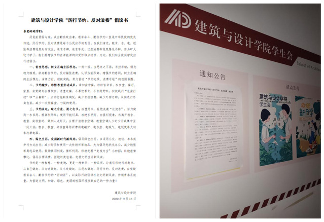 为弘扬勤俭节约传统美德,引领节约良好风尚,帮助同学们形成良好的节约意识,营造勤俭节约的校风,9月21日下午2时,建筑与设计学院学生会生活权益部于桃苑四号楼、竹苑四号楼、设计学院学院楼进行“厉行节约、反对浪费”倡议书的发放与张贴。设计学院生活权益部全体成员参与了此次活动。