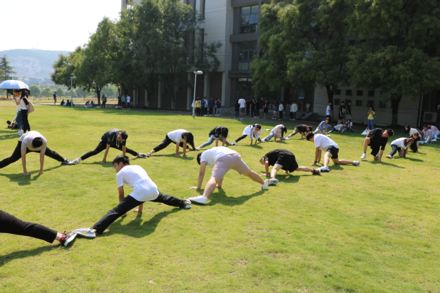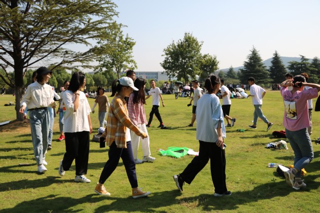 活动伊始,心理自助中心成员首先带领各班级进行了“破冰”游戏,现场氛围逐渐高涨。随后,同学们进行了“比腿长”、“心有千千结”、“桃花朵朵开”等多个集体娱乐活动,在游戏中失利的小组也接受了相应的“惩罚”——进行才艺表演。同学们积极参与游戏,很快就打成一片,活动现场到处都是欢声笑语,轻松有趣的游戏拉近了彼此之间的距离,同学们之间也逐渐提升了默契度。活动进行到团队合作游戏“贴一贴”时,氛围达到高潮,同学们在活动场地奔跑追逐,每个人脸上都洋溢着欢乐的笑容。活动最后,全体成员合影留念。