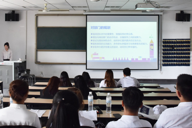 会议于2点准时开始。同学们有序上台进行PPT讲解展示,他们分别从自我介绍、工作经历、竞选职务认识、自我反思以及任职规划等方面进行3分钟竞选演讲,随后根据答辩老师们的提问进行答辩。同学们对过去一年的工作进行了总结,分享了在过去一年中的感悟与收获,阐述了自己的竞争优势,展示了未来工作的思路。演讲环节中,竞选宣传部部长的安琪同学这样谈到:我们部门有70%创新力、50%的亲和力,其次是85%的参与力以及100%的执行力。在工作方面,部门将积极参与并认真执行分配的工作任务,在未来将继续保持。随后,评委们结合同学们的讲解以及各个部门的工作特色进行提问,竞选者们结合具体的工作事例详细认真地回答了老师的问题,有条不紊,思路清晰,获得了老师及主席团的认可。答辩结束后,所有同学有序离场,答辩评委老师进一步商讨结果。