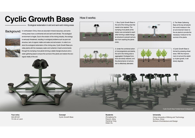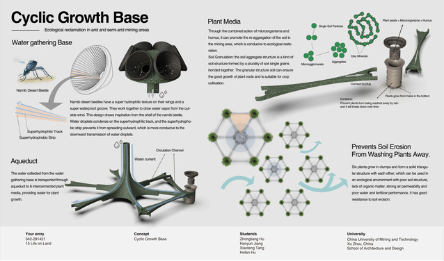 自报名以来,团队成员认真思考选题,深入调研,主动与指导老师沟通交流,不断对参赛作品进行完善、打磨。该团队的设计作品旨在通过植株固定形成的六边形结构和一个顶部集水基的组合,在恶劣的土壤结构中为植株提供生存必要的水分和养分,确保植株正常生长,以改善土质、恢复土壤生态活力及开采结束后的矿区生态,对环境保护起到一定的改善作用。