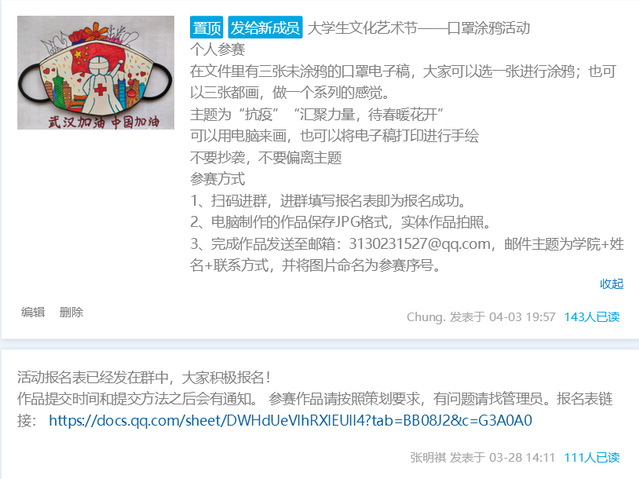 同学们以“汇聚力量,待春暖花开”为主题,进行创意口罩涂鸦,不仅在绘画中传达了对战“疫”期间逆行者们的支持与感谢,也丰富了同学们的课余生活,让他们在紧张的学习期间劳逸结合。由于疫情原因,活动采用线上形式进行,活动从4月1日开始,4月25日截止。4月1日至4月5日,由生活部制作海报、建立QQ群,发布报名表,对同学们提出的问题进行及时的解答。4月6日至4月25日,同学们进行口罩电子稿涂鸦,完成后发送至指定邮箱。截至4月25日共收集到作品42份,体育部部长富海天将作品进行整理并制作评分表。活动最后,设计学院与资源学院负责人对作品进行评分,整理后进行公示。至此,活动圆满结束。