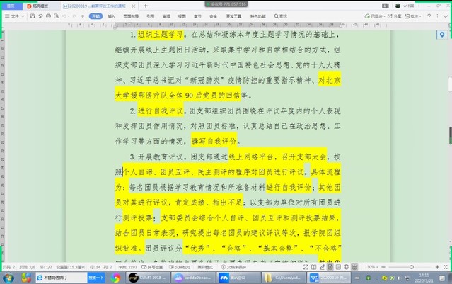 为组织团员学习习近平总书记对“新冠肺炎”疫情防控的重要指示精神,对团员的表现和作用发挥情况进行综合评价,3月21日下午2点,建筑与设计学院音乐学18-1团支部于线上召开五四团评前期工作委员大会云会议,本次会议由团支书韦紫奡主持,班级全体成员参加。