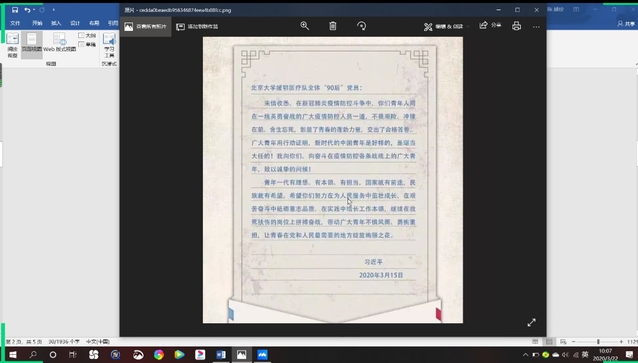 会议伊始,全体团员在团支书的带领下学习了习近平总书记给北京大学援鄂医疗队全体“90后”党员的回信,并各自发表了自己的感想和体会。同学们畅所欲言。心理委员说道:“这封回信是对新时代的中国青年的深情点赞,这令我更进一步坚定抗疫信心,我们坚信武汉必胜!中国必胜!”接着,团支书组织同学们开展互评工作。会议最后,陈越佼同学提出了下一阶段的重点工作,并对接下来的工作安排进行了详细说明。
