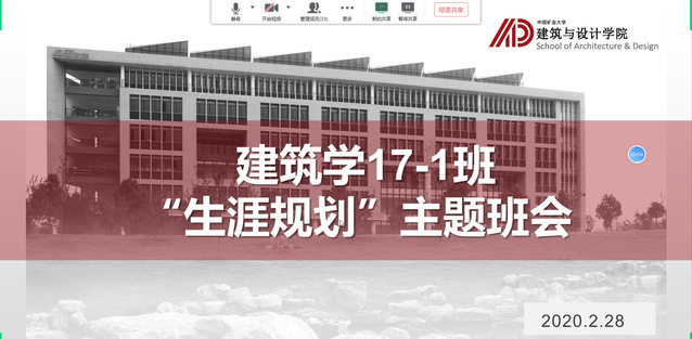 2月28日下午3点半,建筑与设计学院建筑学17-1班于网络上开展生涯规划班会。因受疫情影响,本次班会在腾讯会议软件上开展。本次活动由班长孙健乔主持进行,班主任张明星老师和建筑学17-1班全体同学参与了本次活动。