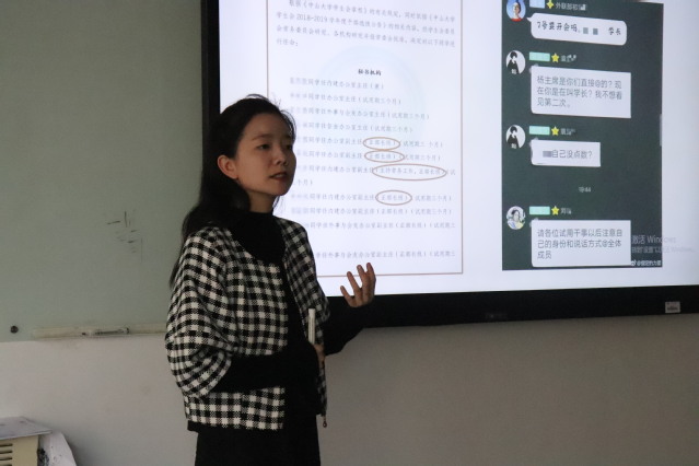 会议伊始,孙艺铭老师从参与学生工作的初心讲起,鼓励学生干部进行思考。学生会主席魏铁飚作为代表分享了自己三年来做学生干部的经验和感悟,他说到,学生会和谐团结的组织文化氛围让自己热爱学生工作,学生工作提升了自己的个人能力。孙老师以热议的案例为出发点,指出学生会是为学生服务的组织,学生干部要培养正确的价值观,杜绝官僚风气,要发挥好带头作用,成为优秀的学生干部,引领他人更好地为学院师生服务。会议最后,孙艺铭老师结合自身经验,对各位学生干部提出三点要求:端正态度,找准定位;提高自身素质,成为一面旗帜;要做到真心待人、用心做事。