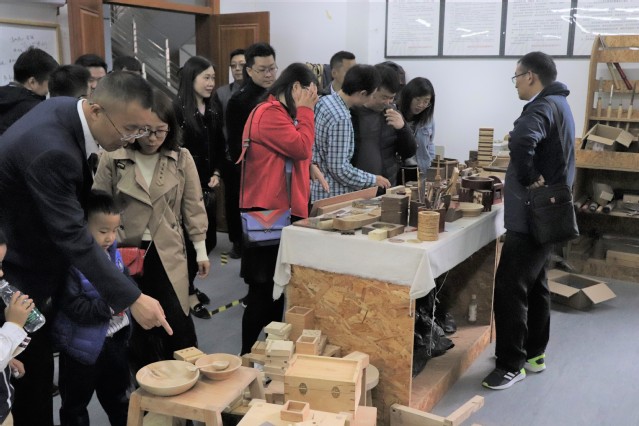 下午校友们陆续抵达后,孙良副院长、张明皓与顾贤光等几位老师便陪同校友们对设计学院进行参观,并向大家介绍了学院木工坊、综合材料实验室及近年新增的单臂协作机器人等实验室的布局规划,参观了学生设计作品展,增加了校友们对学院近年来所取得的教学科研成果、实践教学体系与学习环境的了解。参观结束后,大家在学院楼前合影留念。