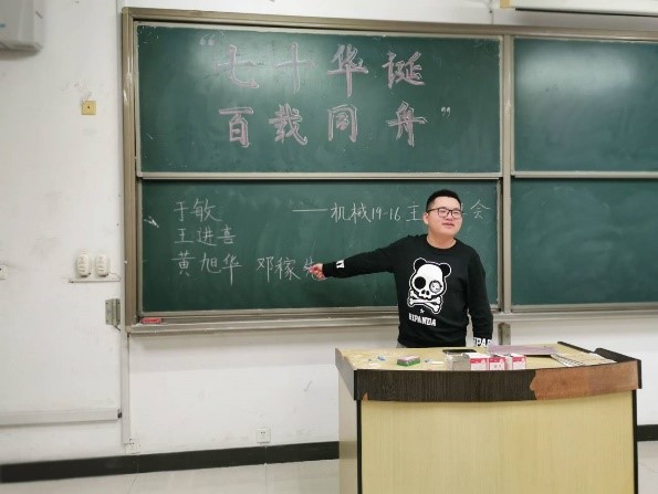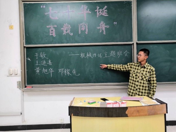 在举国欢庆新中国生日之际,建筑与设计学院机械类19-16班在团支书朱城立的主持下于10月11日在博三B402教室开展了“七十华诞,百载同舟”的国庆主题班会。