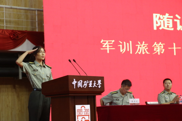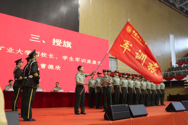 大会上,简短的军训影片落下帷幕。全体奏唱国歌后,副校长曹德欣宣读了2019级学生军训旅组成人员名单,并对承训教官的到来表示热烈的欢迎和崇高的敬意。随后,副校长曹德欣为军训旅授旗。授旗结束后,矿大党委副书记、学生军训旅政委王增国发表讲话,他提到,军训是国家法律规定的大学生必修课程,是高校人才培养的重要途径,是全民国防的基础。制度化、法律化的军训制度为新生大学入学教育的开展提供保障。