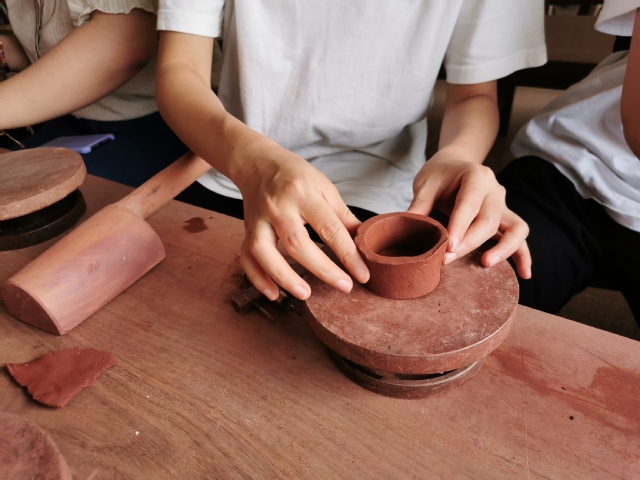 队员亲自动手体验紫砂壶制作过程