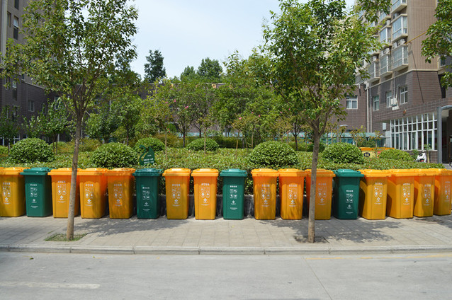 当地摆放整齐的人工分类垃圾箱
