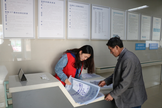 当日,同学们准时到达徐州市第六人民医院,联系到医院相关负责人,穿上红色志愿者马甲,开始导医活动。活动伊始,志愿者们在相关医护人员的指导下了解了挂号区、服务台、放射科取片前台等区域位置,以及导医活动的具体任务。一部分志愿者负责协助前来就诊的病人尽快找到挂号就诊地点,以及搀扶行动不便的患者前往就诊地点,并帮助不会使用机器的病人及家属打印报告单。另一部分志愿者负责在放射科的服务台帮助病人及其家属取片。在导医志愿服务过程中,长时间的站立让志愿者们的身体略有疲惫,但志愿者们依然保持积极热情的状态提供服务。下午五点,活动结束,志愿者们为营造良好便利的就医环境尽心尽力,细心周到的服务也收获了医护人员们和病人们的称赞。