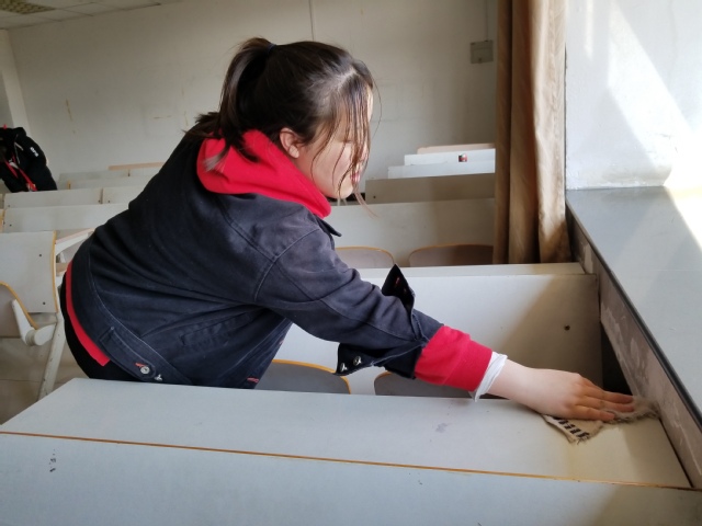 下午2点,两个党支部的所有成员佩戴党徽,带着清扫工具在博五教学楼前集合。在活动开始前,15级建筑学党支部副书记陈莉贞为大家介绍了此次志愿活动的任务,并提醒大家要注意安全,同时也要保持安静,以免打扰正在自习的同学。之后,同学们分为7组,分别前往A、B、C三个教学区清扫教室。女生主要负责擦拭桌子,男生主要负责擦拭黑板、整理桌椅。大家分工有序,行动安静,工作高效。下午4点,支部成员们陆续打扫完博学五号楼的卫生,各教室在大家的辛勤清扫下重回干净整洁。