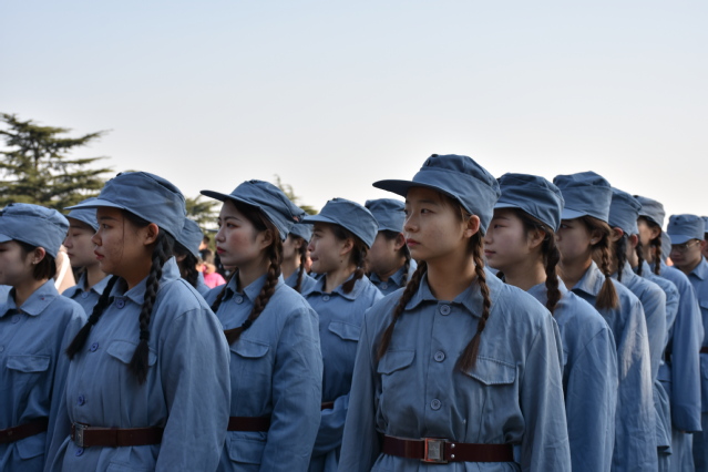 建筑与设计学院发挥音乐学专业优势,组建优秀的合唱团队,演唱《乘胜追击》《歌颂淮海胜利》淮海战役组歌二首,歌颂人民军队决战决胜的英雄气概。寒风凛冽,音乐系学子依然军装笔挺,意气风发,展现了设计学院昂扬的精神状态。两首曲目节奏铿锵有力,旋律激情昂扬。在朱文老师的指挥下,男声与女声呼应相融,恢弘大气、嘹亮雄壮。观众肃穆直立,沉浸其中。“此次合唱排练时间短、任务重”,朱文老师说,“就喜欢遇到大事,大家一起拧起一股绳的劲。”在音乐系师生的共同努力下,最终大家以昂扬的风貌展现了奋斗精神,用浑厚的旋律唱响了爱国信仰。