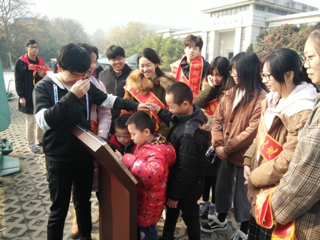 徐州启聪聋哑儿童康复中心的孩子们初见志愿者大哥哥大姐姐们显得既兴奋又有些拘束。为了活跃气氛,拉近与孩子们之间的距离,部分志愿者带领小朋友们玩起了老鹰捉小鸡的游戏,欢乐轻松的气氛不断蔓延,感染了在场的每个人。与此同时,有的志愿者默默地找来扫帚和拖把,打扫起活动室来,有的志愿者发挥专业特长,教起孩子们做手工和画画。随后,在征得启聪聋哑学校徐老师的同意后,志愿者们带领孩子们来到了离聋哑学校不远的徐州市淮海战役纪念塔进行参观,孩子们都兴致高昂,现场气氛十分融洽。“有的孩子走累了,我们便背着孩子们走。没有任何语言表达,只有脸上绽放的笑容”建筑16-3班汪配龙同学说。