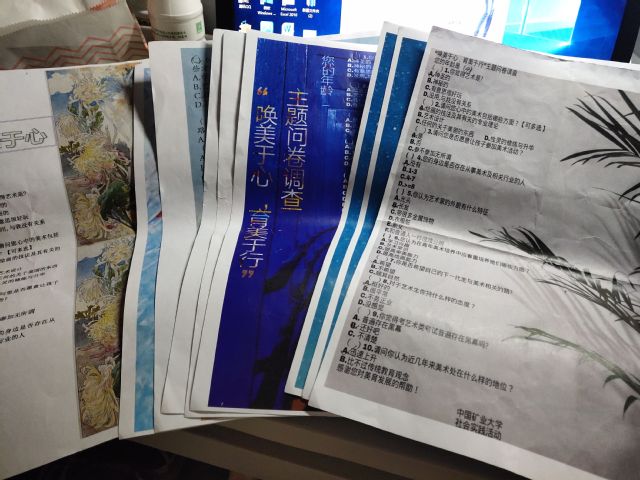 活动开展之前,环设18-2班的同学们共同商议确定了活动主题、采访对象、采访提纲以及活动开展流程,为活动的顺利进行做了充分准备。同学们分别去往矿大两个校区采访各类市民,包括如书店老板、环卫大爷、学生等,同学们向市民们介绍了当今艺术的发展,让他们对此有了新的了解,同时询问市民们喜爱的艺术表现形式。