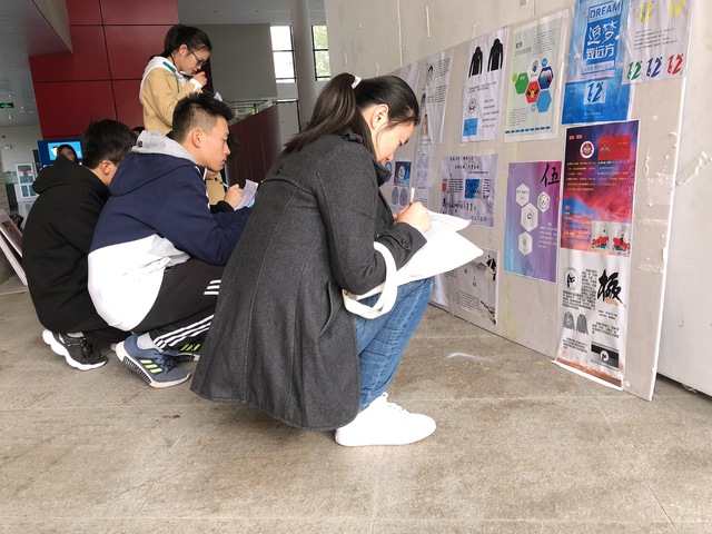 在评比开始前,设计学院团委实践部部员提前到场对展厅张贴好全部作品海报,经过第一轮筛选后,此次评比共有94份参赛海报,海报风格多样,内涵丰富,颇具创意。设计者从设计理念与设计灵感对作品展开说明,如建筑5班将“建”拆分成“5”和“小船”,不仅作为专业与班级的标志还寄托了扬帆航行的志向,建筑1班将班级所有同学的名字融聚在“1”的艺术字中,安全4班以渐变蓝色作为流星与水滴表达了建设团结班级的决心。各学院主席团一丝不苟地观看参评海报,对比各个作品并相互交流意见,从版式、创意、含义、发展等角度,综合了班级和学院等因素给出了自己的评分。设计学院实践部对评分表进行回收统计以便第三轮评选的开展。