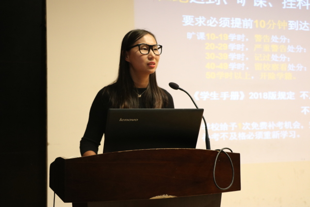 最后,18辅导员郭丽婉开展了具体的生涯指导,她着重从了学习、全面发展、做好生涯规划、树立规则意识四个方面进行了指导。郭丽婉老师巧妙地将大学四年中学生的自我状态概括为“不知道自己不知道”“知道自己不知道”“不知道自己知道”和“知道自己知道”四个阶段,鼓励同学们做自由、自律、自信、自强的当代大学生。