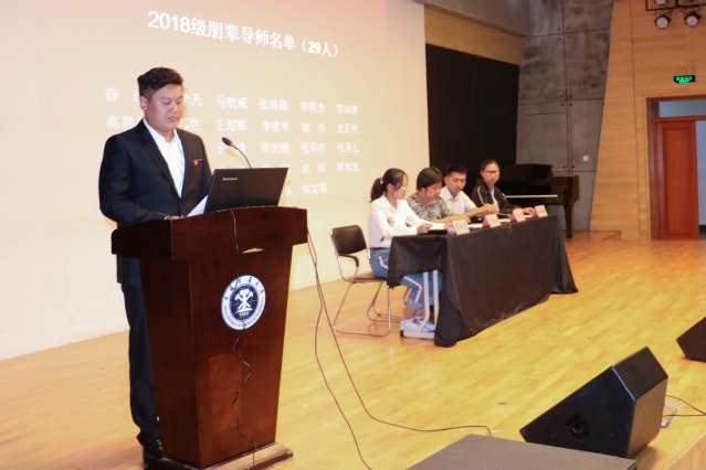 大会最后,范韶维副书记介绍了朋辈导师的产生过程,着重强调了前辈对后辈的引领指导作用和互利共赢、协同合作的优势。另外,范韶维副书记指出朋辈导师对于学生思想政治引导工作的开展具有重要意义。她殷切期望新任朋辈导师能够认真领会,用心工作,全面发展,发挥朋辈导师的帮助、指导、引领作用,为18级新生打开思路,适应大学生活贡献出智慧和力量。
