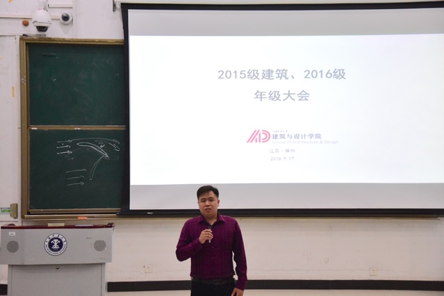 为了新学期工作的顺利开展,并对同学们的日常工作进行规范,9月17日晚七点整,建筑与设计学院于博学楼二号楼C102召开了建筑学2015级、2016级年级大会。学工办主任孟子浩、兼职辅导员曹炎磊和2015级、2016级全体同学参加了本次大会,本次大会由曹炎磊主持。
