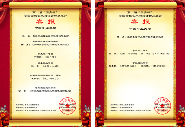 本次展评征集活动分为老师组和学生组,学院环境设计系杨勇老师的《设计教学中的非线性思维探索》获得教师组科研成果一等奖,同时获评优秀指导老师。学生组中,学院研究生李南荣的《困·惑》获得一等奖、陈曼等的《中国·二胡》获得二等奖、王航宇的《霾了到没了》获得动画类作品优秀创作二等奖、苗蓁的《诗词意蕴对城市品牌塑造力的探究》获得论文三等奖;本科生中,苗薇的《WIFI与沙漏》与周玥的《“W”有引力》获得二等奖、勒李艳的《翠花学设计》与王延琢的《保护动物》获得三等奖。
