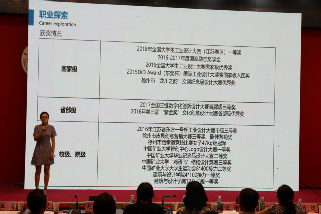 现场比赛分为选手展示和评委提问两个环节。每位参赛选手进行不超过4分钟的职业生涯规划陈述与展示,并接受评委3分钟提问。15位参赛选手通过PPT展示,从自我分析、职业认知、实施路径等方面进行展示,激情饱满、各显风采。设计学院童姗姗作为11号选手出场,个人陈述自信、大方,语言表达流畅、有节奏感,逻辑思路清晰、有层次,对评委的提问对答如流,整体表现优秀。比赛结束后,徐工集团人力资源部部长蒋磊作点评,她从“早与晚”、“取与舍”、“冷与热”三个方面提醒所有在场的同学要尽早确立自己的职业目标,并不断加以完善,也希望这次比赛能够帮助大学生正确认知自我、认识社会、认清未来。