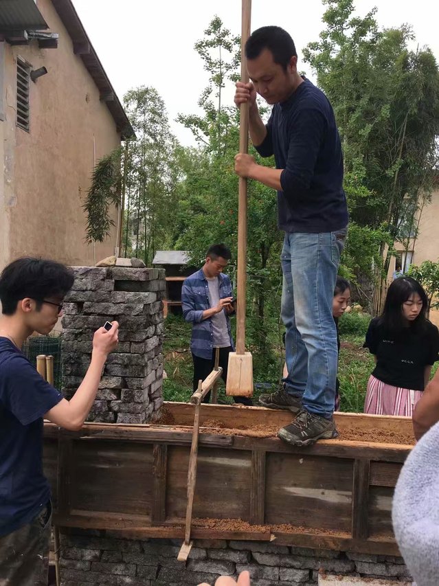 8月11日,中国矿业大学建筑与设计学院“夯土建筑施工研究”暑期社会实践团在浙江省湖州市安吉县参与了夯土建筑施工体验活动。团队在著名环保建筑师任卫中和指导老师的带领下,使用配置的原材料,开始夯土制墙,为竹片墙抹面。