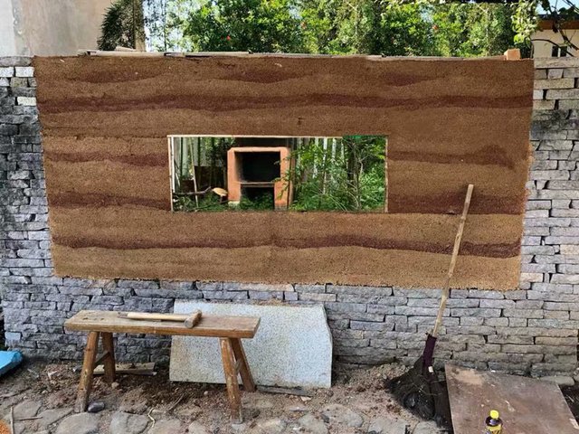 团队配置了几种不同色材料,以便观察它们的性能区别,了解了夯土过程中需要注意的细节。夯土目标在于除去土壤间隙,排除空气,使墙面各处疏密均匀,因此模具至关重要。在使用老师制作改良的夯土器具过程中,团队成员感受到了传承的重要性。改良后的木质模具,简单易造,材料易取,操作方便,便于推广。午后,团队开始进行竹片墙抹面工作,学习了抹面手法。泥土以及其配料均来源于自然界,无化学产品添加。其中,泥土是多孔隙材料,不会封闭墙体,能调节室内空气湿度。泥土饰面可呈现出自然材料特有的天然质感,给人一种亲切的感受。