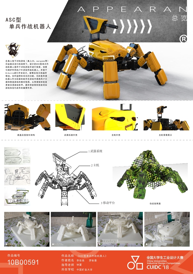 由钟厦老师指导,学生李佳亮、罗秋曼设计的作品“ASC型单兵作战机器人”获得一等奖。此项作品是学科资源高度整合、师生团队通力合作的结果。在设计准备期间,遇到不懂的问题,李佳亮同学多次向机电学院、信息与控制工程学院等相关学院的同学请教,还在线上与同领域的国外学生共同探讨。指导老师钟厦利用周末时间对作品进行指导,多次对作品提出修改意见,让作品在反复修改中不断精进。问及设计灵感,李佳亮同学说:“这得益于学院对生涯规划的重视,让我找到自己坚持的方向,也就是人工智能。为了把这条路走得更远,我已经申请出国学习了。”