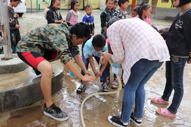 为了督促孩子们养成讲卫生、勤洗手的好习惯,7月26日上午,建筑与设计学院18筑梦公益四分队队员胡雅静、于国琛、赵英昊等在团队老师贾振老师的指导下,于黔西南州普安县兴中镇辣子树小学二年级学生中展开了规范洗手的教学活动。