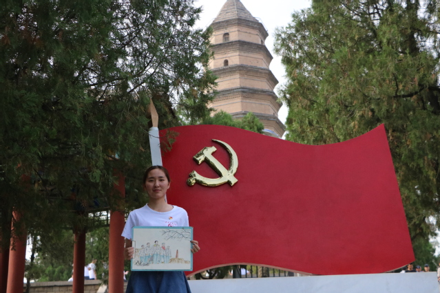 到达延安后,追寻信仰新青年实践队首先来到了位于宝塔区的宝塔山上,追寻革命足迹。“几回回梦里回延安,双手搂定宝塔山”,著名文学家贺敬之的名句热情的讴歌了宝塔山在中国人民心目中的神圣地位。在宝塔山,实践队成员们受到了一位来自延安职业技术学院附属小学四年级的少先队义务讲解员热情招待,他声情并茂的讲解了宝塔山的历史以及革命故事并饱含激情的为实践队朗诵《回延安》。实践队成员也现场创作了一幅漫画“小小义务讲解员”,赠予这位少先队员并与其合影留念。