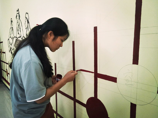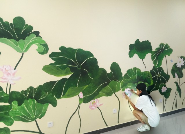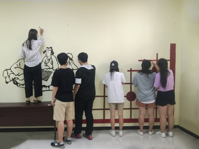 上午7点,队员们统一乘坐公交车前往李庄。经过了2个多小时的车程,队员们虽然略显疲惫,但到达实践地点后,便立马开展活动。队员们用木板丈量长短,用铅笔在墙壁上打好底稿,用颜料认真描绘。天气异常炎热,队员们虽然汗流浃背,但仍然手握画笔一丝不苟。墙绘一直持续8个多小时,8名队员将党的十九大精神、社会主义核心价值观和当地风土人情结合在一起,制作了“荷花图”、“精彩对弈,棋乐融融”等墙绘。一位窗外驻足的村民说:“这些孩子都是“神笔马良”呐,画什么像什么哦。”