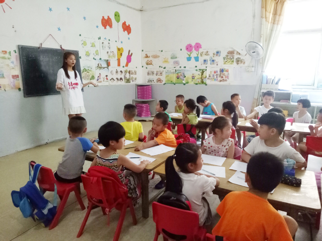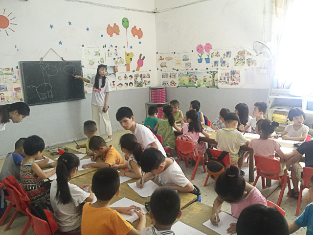 下午2时,队员们集体乘车前往李庄“畅畅幼儿园”,开展艺术辅导活动。队员们一来到幼儿园,就感受了幼儿园老师和小朋友的热情,和小朋友们逐渐熟悉起来。由于幼儿园的美术课一周只有一次,小朋友们非常渴望上美术课,所以队员们决定先上美术课。队员刘姝妧站在讲台上,一笔一划地分解画长颈鹿的过程,小朋友们认真地跟着老师后面学习。其他队员在台下手把手地指导小朋友们,小朋友们积极跟老师进行互动,课堂气氛轻松活跃。