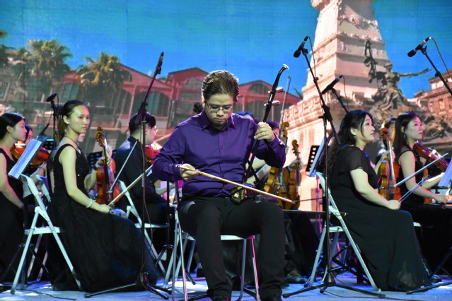 接着,建筑与设计学院音乐系主任刘振老师演奏了根据蒙蒂的小提琴版本改编的《查尔达什舞曲》,他的二胡演奏时而充满激情,时而略含忧伤,时而活泼热烈,时而委婉深沉,仿佛在舞台中央出现了一幅生动描绘匈牙利人民生活的民俗画。接下来,出自迪士尼经典动画的《狮子王》和威尼斯的流行歌曲《弦乐小夜曲》八重奏轻快的响起,欢快的节奏带给观众们美妙的视听盛宴。紧接着,在节奏感极强的《加勒比海盗》和出自宫崎骏动画的《幽灵公主》音乐声中,把观众带入了“二次元”的世界。随后,《圆舞曲二号》、流行曲《碟中谍》和《王者荣耀》让音乐会进入了一个又一个的高潮。