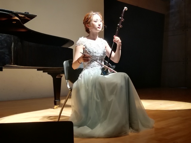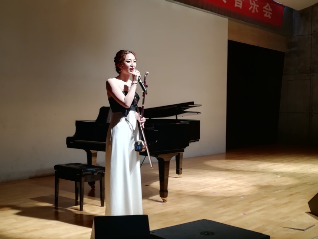 晚上7点,在主持人张书畅的介绍下,“心·弦”音乐会正式拉开帷幕。首先,由杨薇演奏,吴凡钢琴伴奏的《查尔达什舞曲》缓缓响起,弦声有若清风飘云、柔情似水,将现场观众引入了诗情画意的音乐世界。接着,二人又为现场观众带来了《葡萄熟了》,钢琴与二胡的结合、西方与东方的交融绘织出如痴如梦般的音乐体验。然后,杨薇与马梦成二人带来了高韶青老师创作的《蒙风》,此曲以蒙古族的民歌以及长调作为素材,用西方的作曲形式写成,是现代二胡作品中的佳作,二人精彩的演奏赢得了观众们的阵阵掌声。
