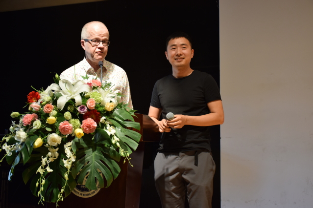 在刘振老师的邀请下,来自加拿大韦仕敦大学的钢琴教授John Orley Hess上台发言,他表示能够来到这里非常开心,这是他第一次来到中国,非常开心能够来到矿大和老师同学们进行不同文化的交流,不同作品上的交流,和大家分享一些来自他的经验。之后,设计学院孙良副院长为其颁发聘书。