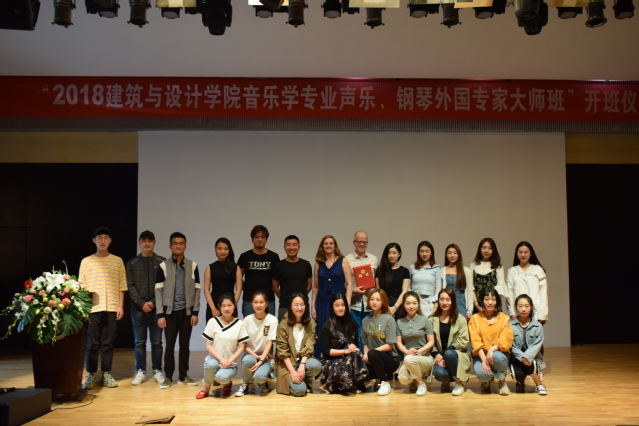 5月8日下午,2018年建筑与设计学院音乐学专业声乐、钢琴外国专家大师班课程开班仪式在建筑与设计学院报告厅举行,本次开班仪式由音乐系系主任刘振老师主持。建筑与设计学院孙良副院长,加拿大韦仕敦大学声乐教授Patricia Green,钢琴教授John Orley Hess出席了本次开班仪式,音乐系教师与大师班学员参加了开幕式。