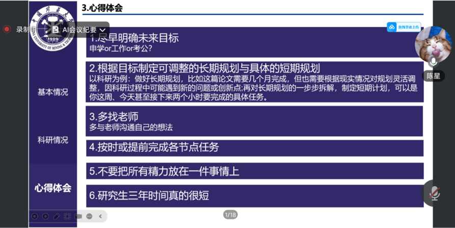 陈星学长结合三年硕士经历,以时间轴形式分享了方向确定、论文投稿、竞赛参与及毕业答辩等关键节点的经验,并坦诚交流应对困难的策略。