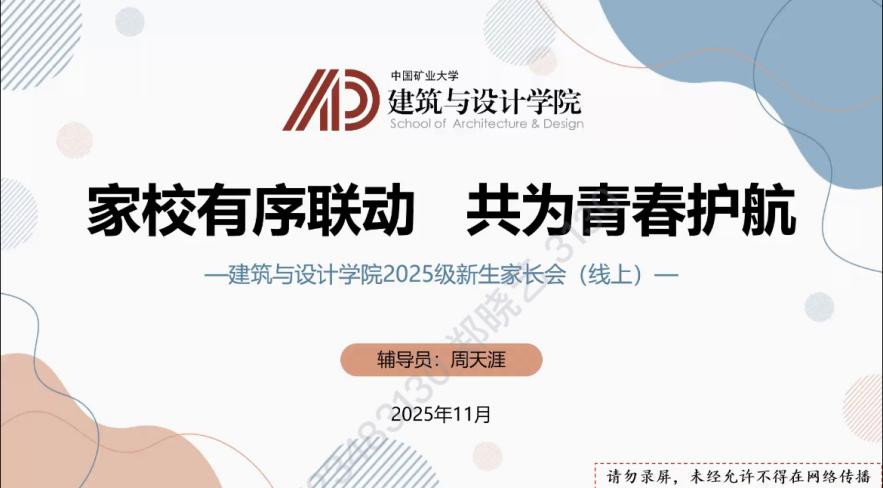 11月6日晚,建筑与设计学院通过腾讯会议召开2025级新生线上家长会。新生辅导员周天涯、郑晓艺、要怡同及200余位家长参会。会议由周天涯主持。
