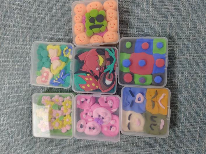 活动开始后,有的同学先勾勒大致构思,再逐步搭配色彩;有的同学即兴发挥,用指尖揉捏、按压、塑形,将普通的粘土转化为精致的花朵、可爱的动物、简约的几何图案等装饰元素;还有同学相互交流技巧、分享灵感,不时传来欢声笑语。从色彩选择到布局设计,从细节雕琢到整体调整,大家专注而投入,原本空白的盒体逐渐被赋予独特的个性与温度。