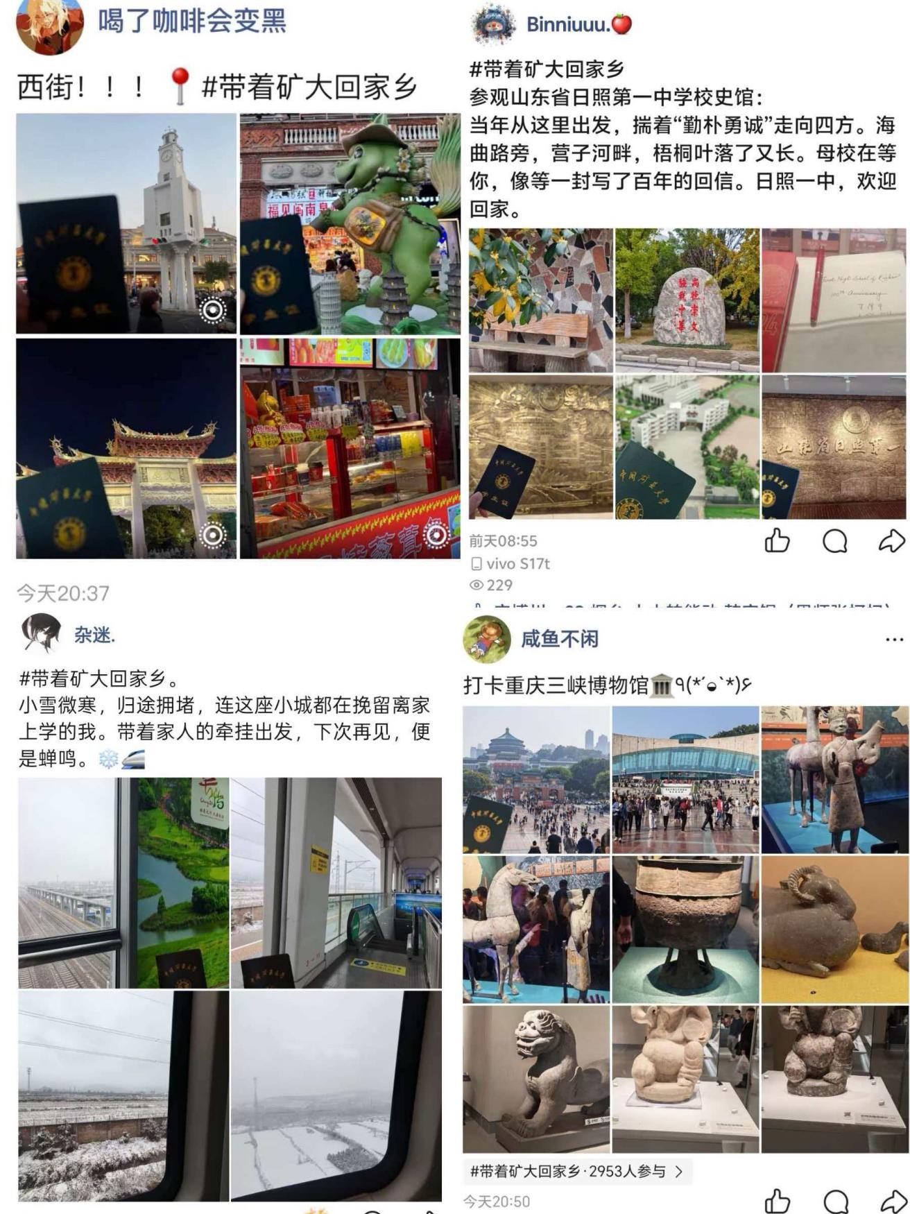 “带着矿大回家乡”不仅是一次简单的打卡活动,更是一次情感的回望与青春的礼赞。同学们在熟悉的故乡风景中,携母校之名,记录成长轨迹,表达对矿大的热爱与眷恋。许多同学表示,活动让他们在假期中依然感受到学校的温暖,也增强了他们作为矿大人的自豪感。