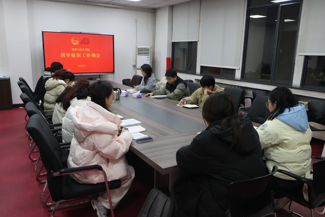 3月5日晚,建筑与设计学院2026年春季学期第一次团学组织工作例会在学院B302会议室召开。院团委书记李艺林、兼职辅导员刘浩东、各团学组织主要负责人参加会议,会议由李艺林主持。